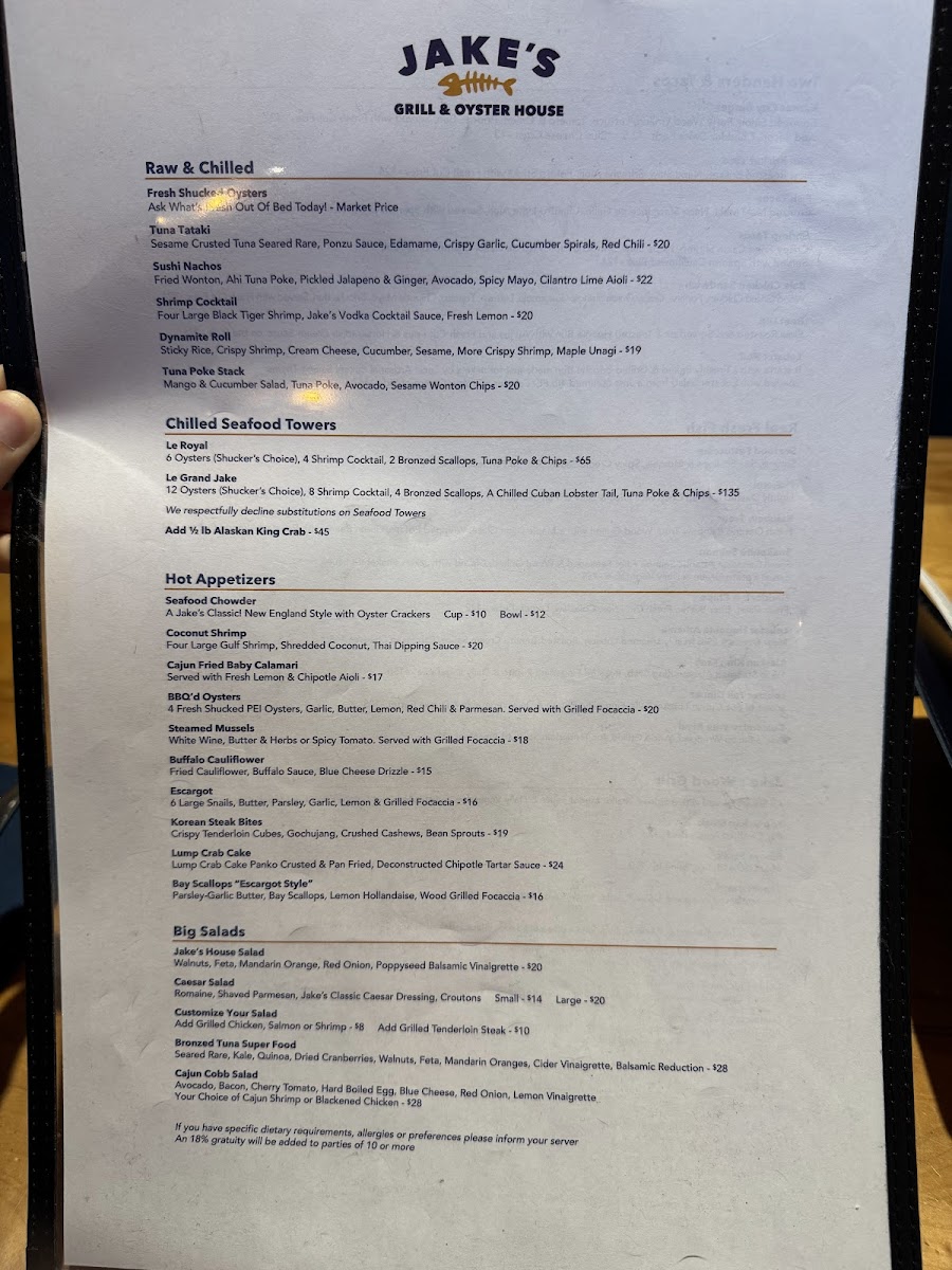 The inviting ambiance coupled with excellent service makes each visit feel special. At Jake's Grill & Oyster House, culinary excellence meets an unforgettable dining experience.